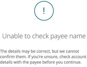 If for any reason we’re unable to confirm that the name and account details match, you’ll see an ‘Unable to check payee name’ message on screen. This could happen if the receiving bank doesn’t respond, there may be a technical error or you are trying to verify an IBAN that isn’t in scope for VOP. We advise you to check the name with the payee by calling them on a known trusted phone number before continuing to create a payee or make a payment.